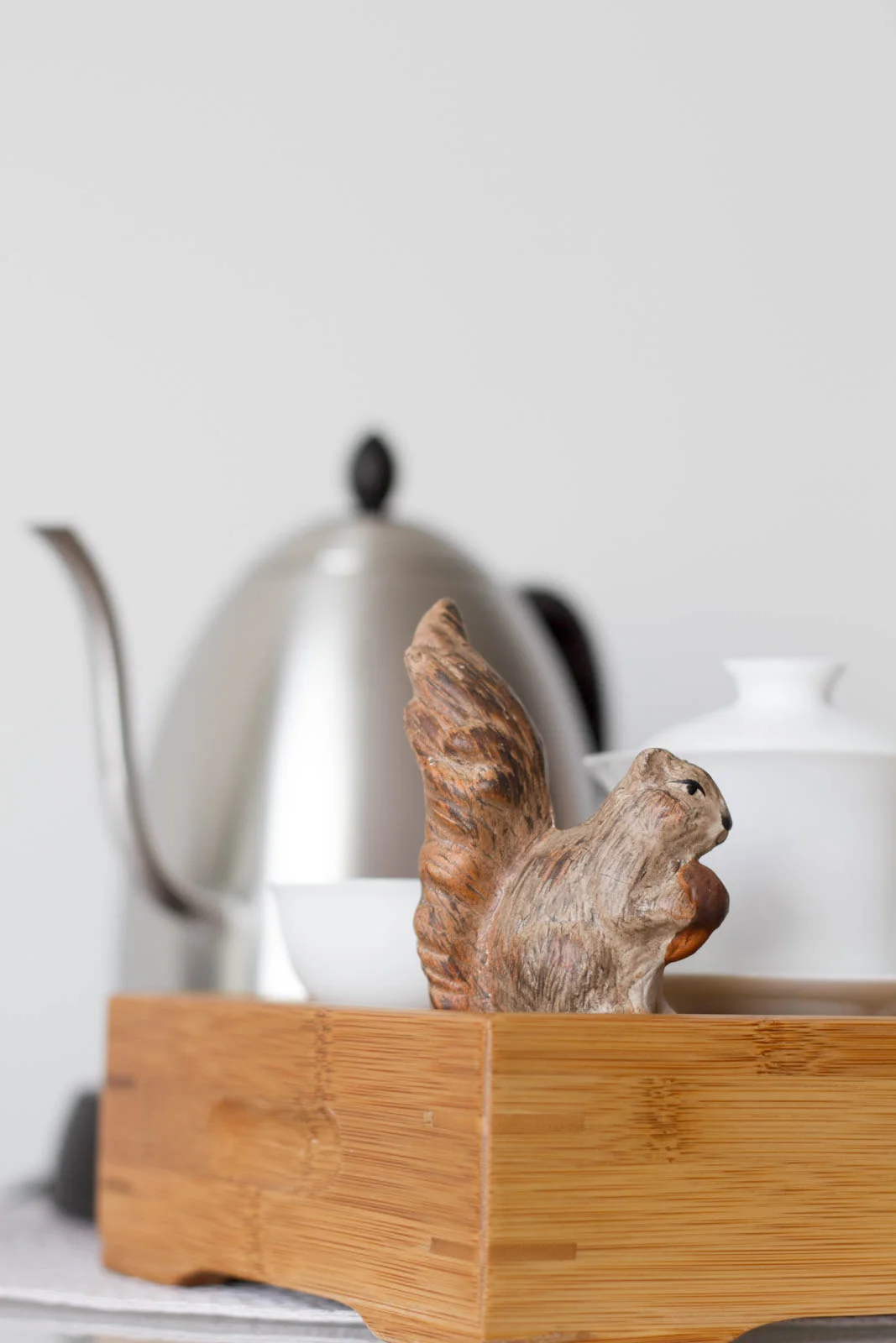 A tea pet is a tea lover’s lucky charm and a low-maintenance tea companion that sits on your gong fu tea tray. A tea pet only needs tea but will be more than happy with the water used to rinse tea leaves before steeping (you would discard it anyway). Traditionally, tea pets are made of clay. Some change color, some squirt water and they are usually animals or Chinese zodiac signs or mythological creatures. They were very likely invented to re-purpose the scraps of clay left from the production of tea pots and then were sold alongside them. My tea pet is a squirrel (can you guess why?). Since I have re-purposed a little figurine I got as a present as a tea pet, I don’t really pour tea on it, I’m not sure that’s a good idea…