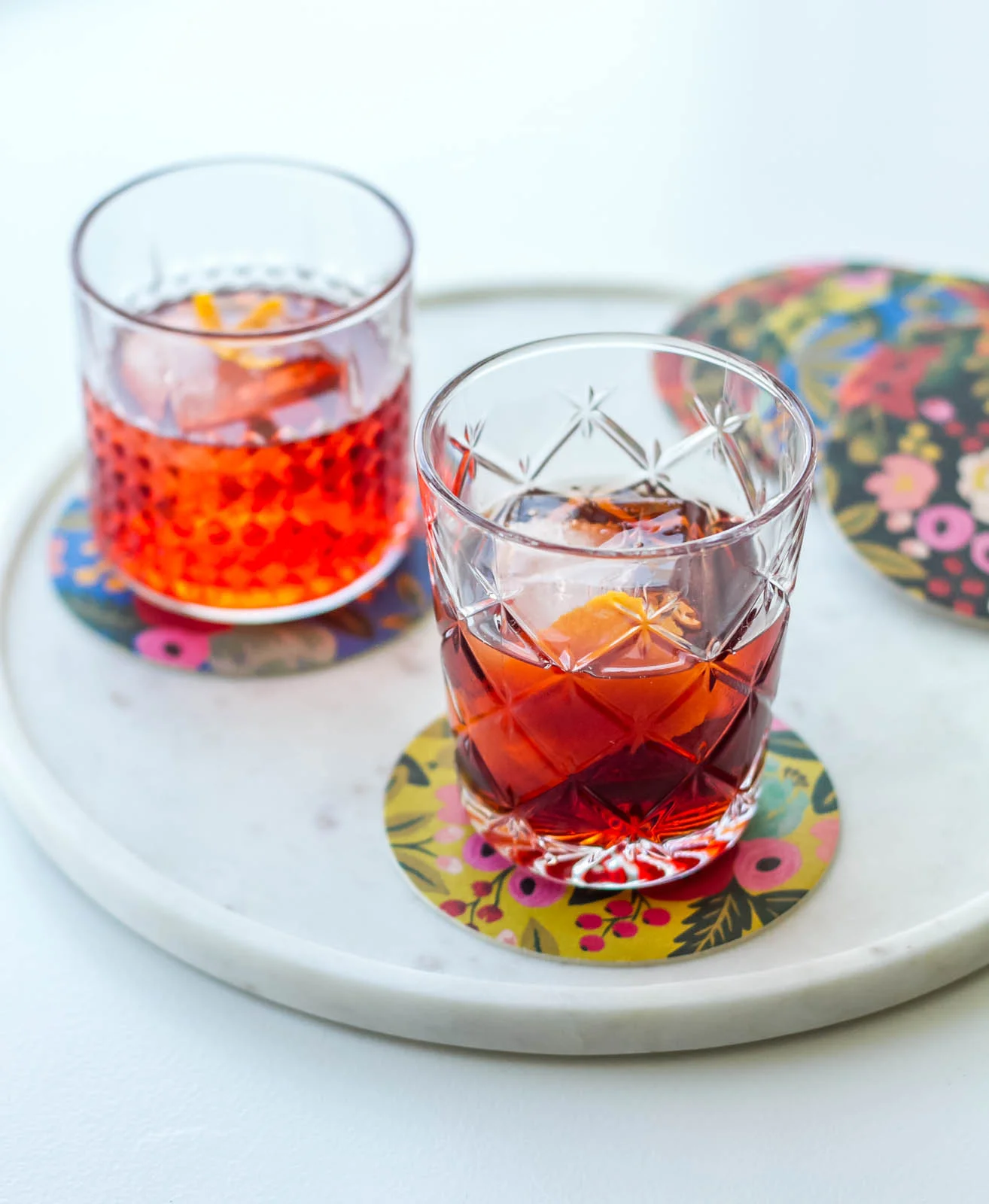 My mixology consultant, aka my husband Chris, helped me incorporate tea in the traditional recipe and test the results. Negroni is one of his all-time favorite cocktails and we had a lot of fun experimenting! We came up with two versions, one floral and more feminine and one bolder and more masculine. Needless to say, we love them both!